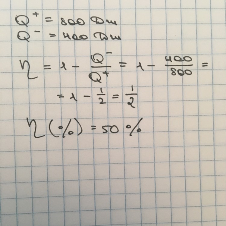 Количество теплоты, полученное тепловой машиной 800 Дж, а холодильник получает 400 Дж. Найти кпд машины.