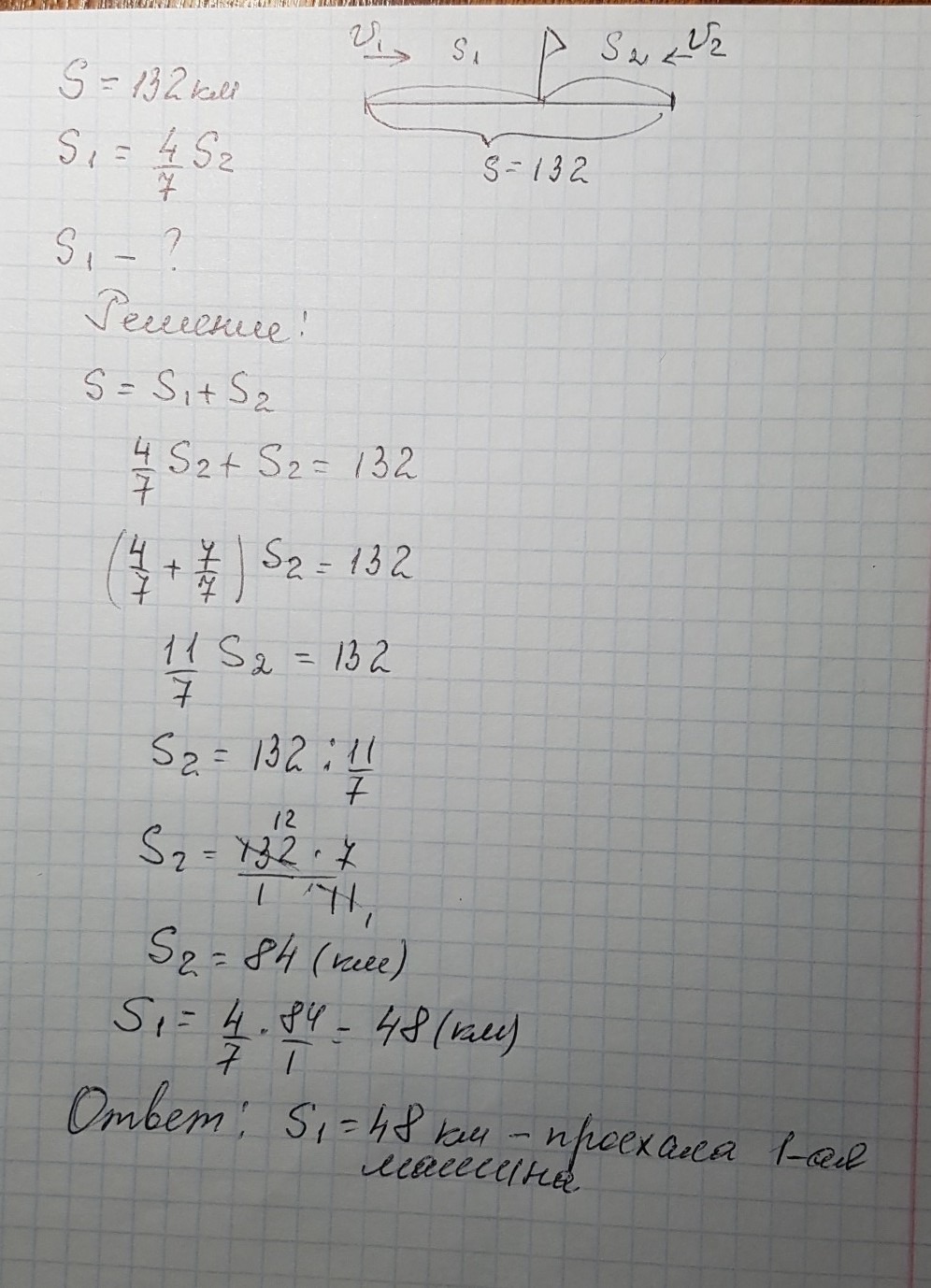 две машины выехали одновременно навстречу друг другу из двух городов, разтаяние между каторыми равно 132 км. Сколько километров к встречи проехала первая машина, если пройдено нею разтаяние равно четыре седмых (дробь) пути, пройденого друной машиной