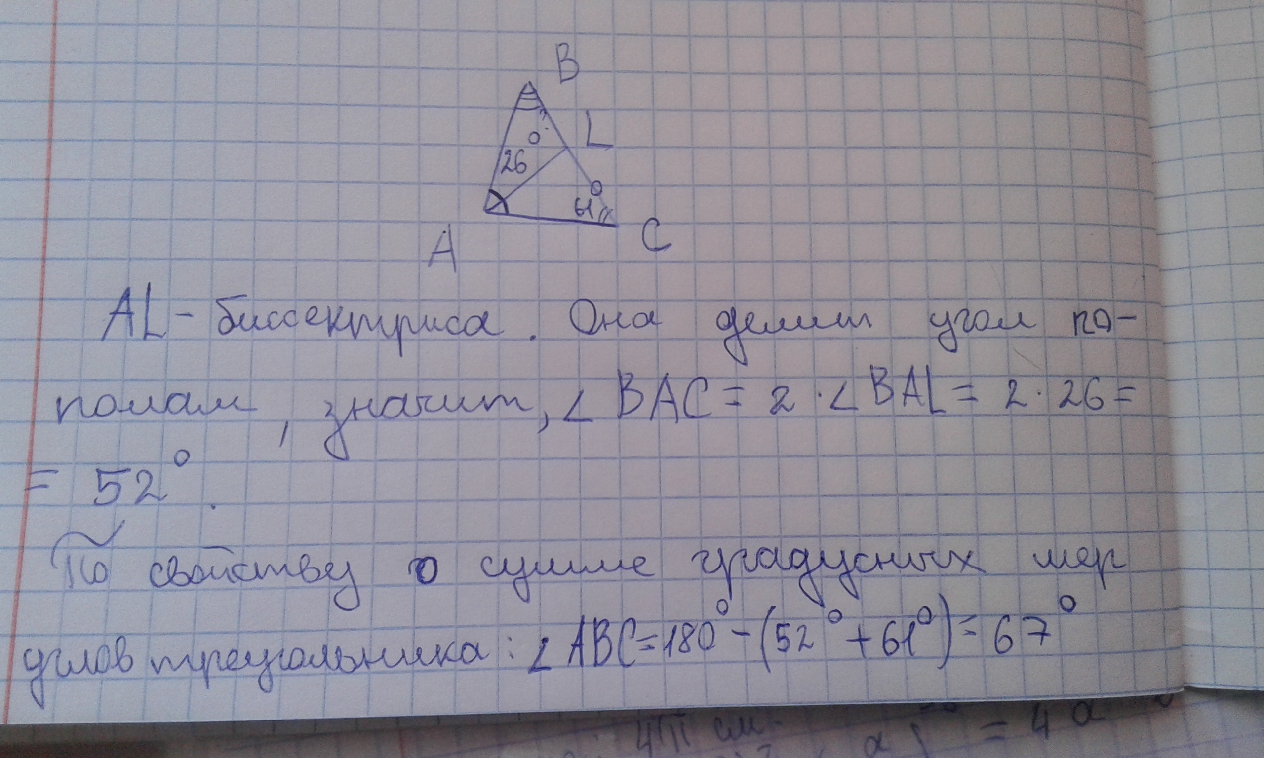 в треугольнике авс проведена биссектриса al, угол в BAL равен 26 градусов, угол АСВ равен 61 градусу. Найдите угол АВС.Ответ дайте в градусах