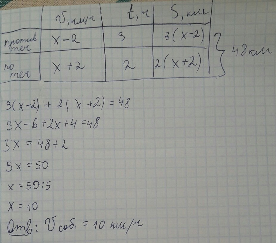 "лодка двигалась 3 ч против течения реки 2 ч по ее течению всего проплылв 48 км.Чему равна собстевенная скорость лодки если ее скорость течения 2 км/ч