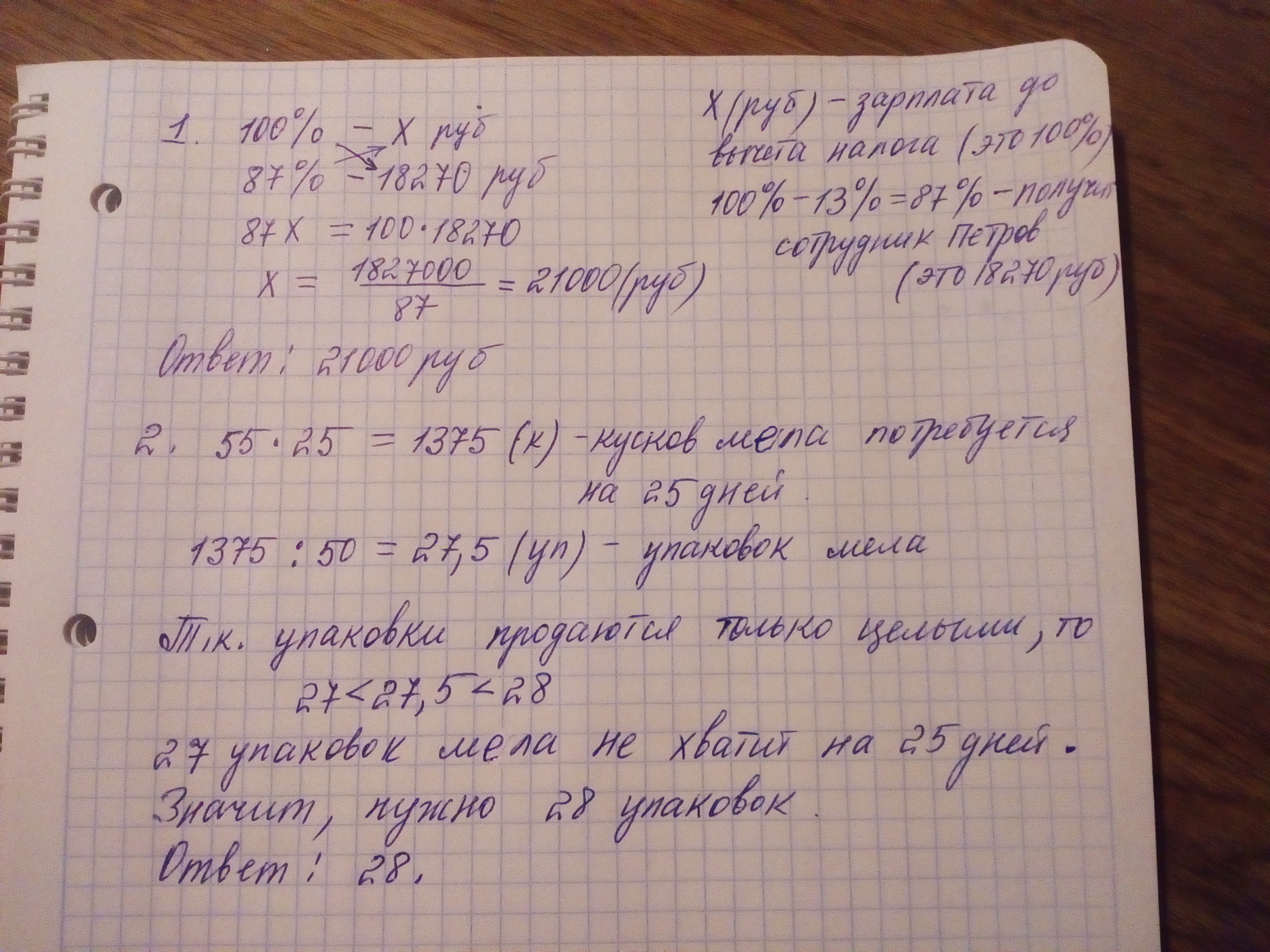 2. В одной коробке 50 кусков мела. В среднем в день расходуется 55 кусков мела. Какого наименьшего количества упаковок мела потребуется на 25 дней?