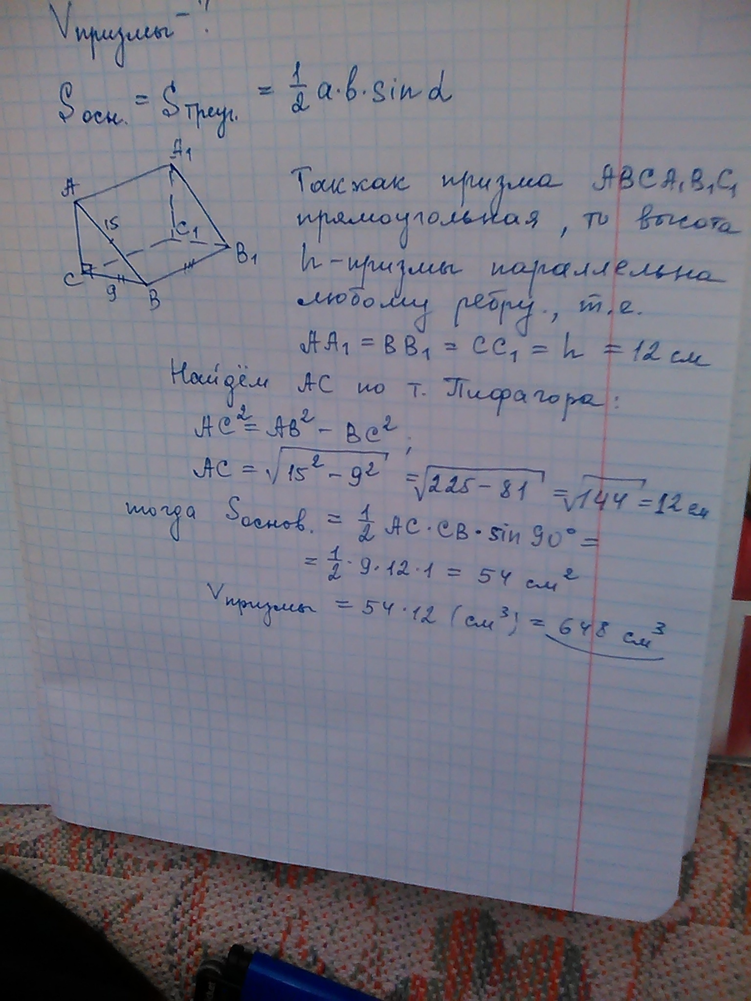 найти объем призмы если в основании лежит прямоугольный треугольник с гипотенузой 15 см и катетом 9 см высота 12 см