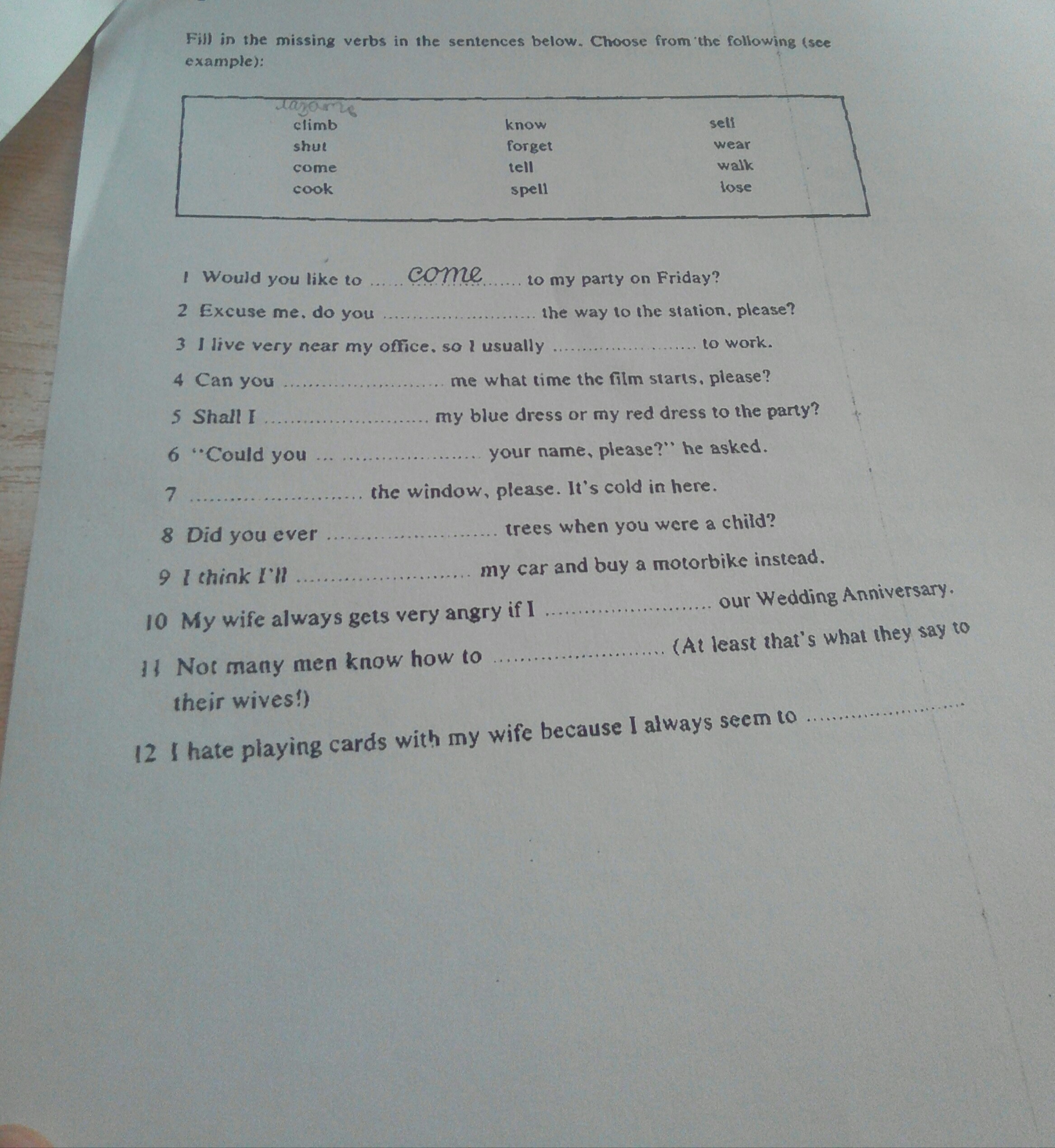 1came 2know 3 walk 4tell 5wear 6spell 7shut 8climb 9sell 10 forgot 11cook 12lose