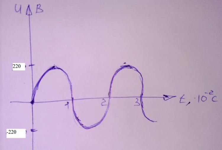 t . Найти амплитуду напряжения, период, частоту. Построить график зависимости напряжения от