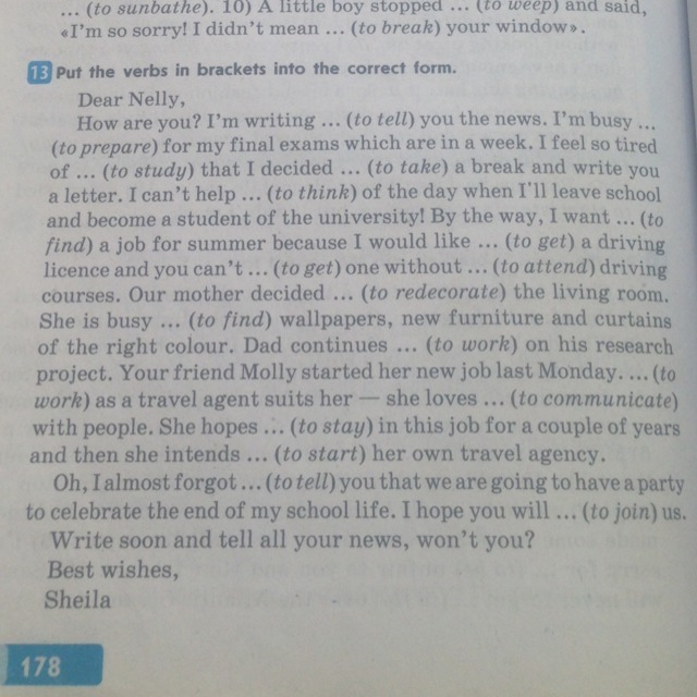 How are you? I'm writing to tell you the news. I'm busy preparing for my final exams which are in a week. I feel so tired of studying that I decided to take a break and write you a letter . I can't help thinking of the day when I'll leave school and become a student of the university! By the way, I want to find a job for summer because I would like to get a driving license and you can't get one without attending driving courses. Our mother decided to redecorate the living room. She is busy finding wallpapers, new furniture and curtains of the right colour. Dad continues working on his researchers project. Your friend Molly started her new job last Monday to work as a travel agent suits her - she loves communicating with people. She hopes to stay in this job for a couple of years and then she intends to start her own travel agency.