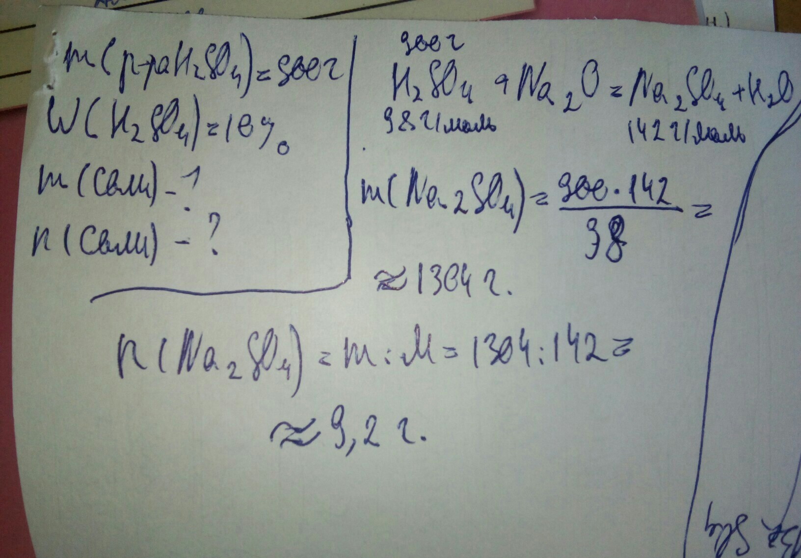 На 900 граммов 10 % серной кислоты H2SO4 подействовали оксидом натрия Na2O . Найдите массу и количество полученной соли.
