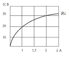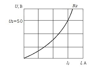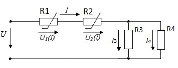 Цепь состоит из двух параллельно соединенных сопротивлений R3=R4=20 Ом и двух последовательно соединенных нелинейных сопротивлений с ВАХ показанными на рис.4.6. Чему равно эквивалентное сопротивление цепи (Ом) и напряжение U (В), если ток через резистор R1 равен 1 А?