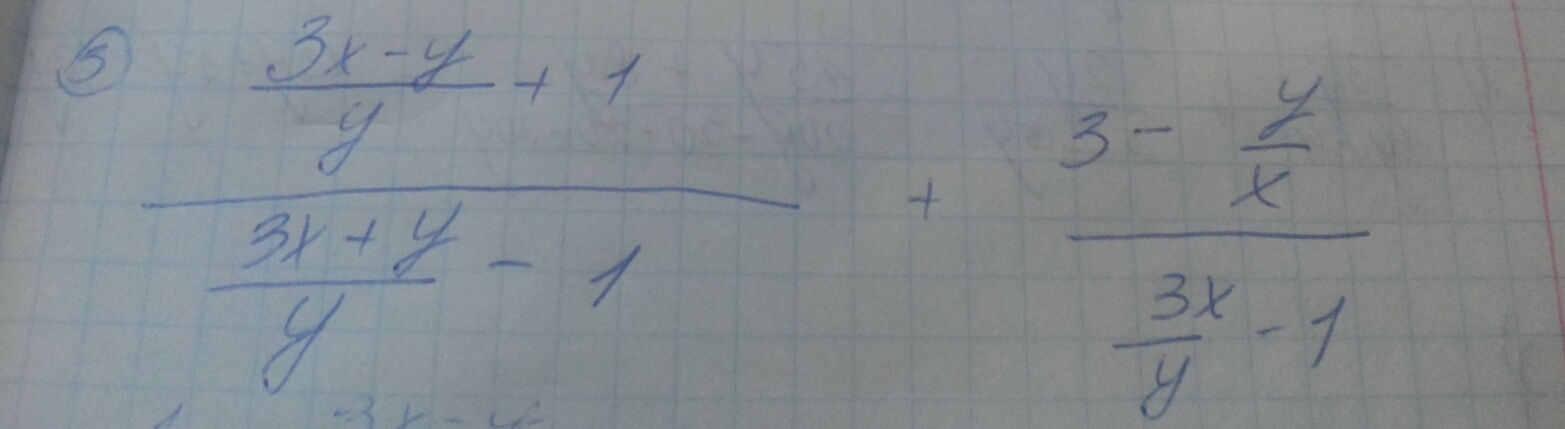 frac{ frac{3x-y}{y}+1 }{ frac{3x+y}{y} -1}+ frac{3- frac{y}{x} }{ frac{3x}{y}-1 } = frac{ frac{3x-y+y}{y} }{ frac{3x+y-y}{y} } + frac{ frac{3x-y}{x} }{ frac{3x-y}{y} }= frac{3x*y}{y*3x}+ frac{(3x-y)*y}{(3x-y)*x} =1+ frac{y}{x}= frac{x+y}{x}