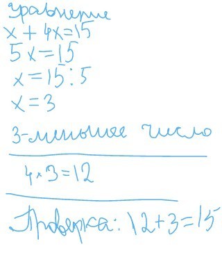 Сумма двух чисел равна15,причём одно из чисел в 4раза больше другово.Определите эти числа путём подбора.(даю 30балов)