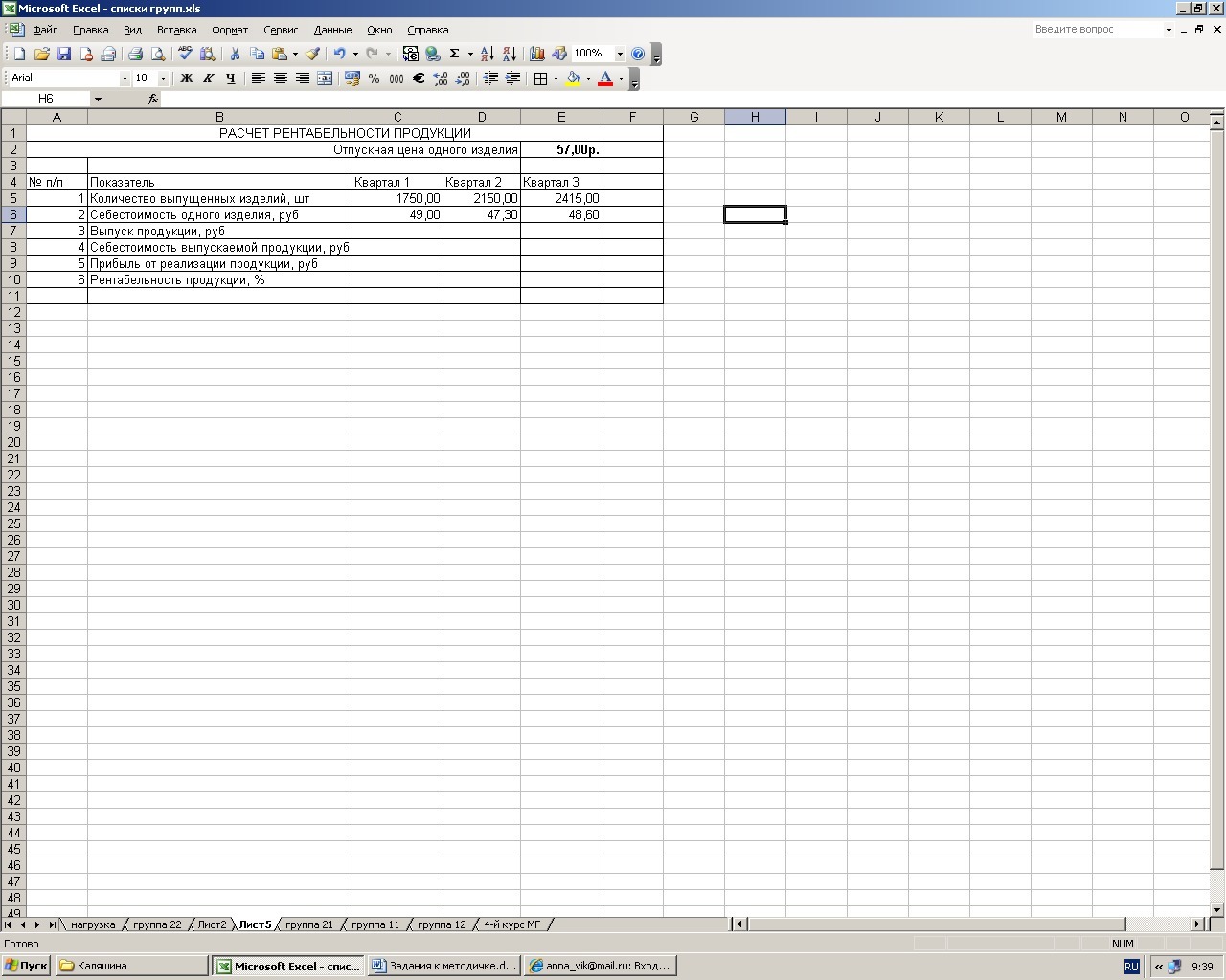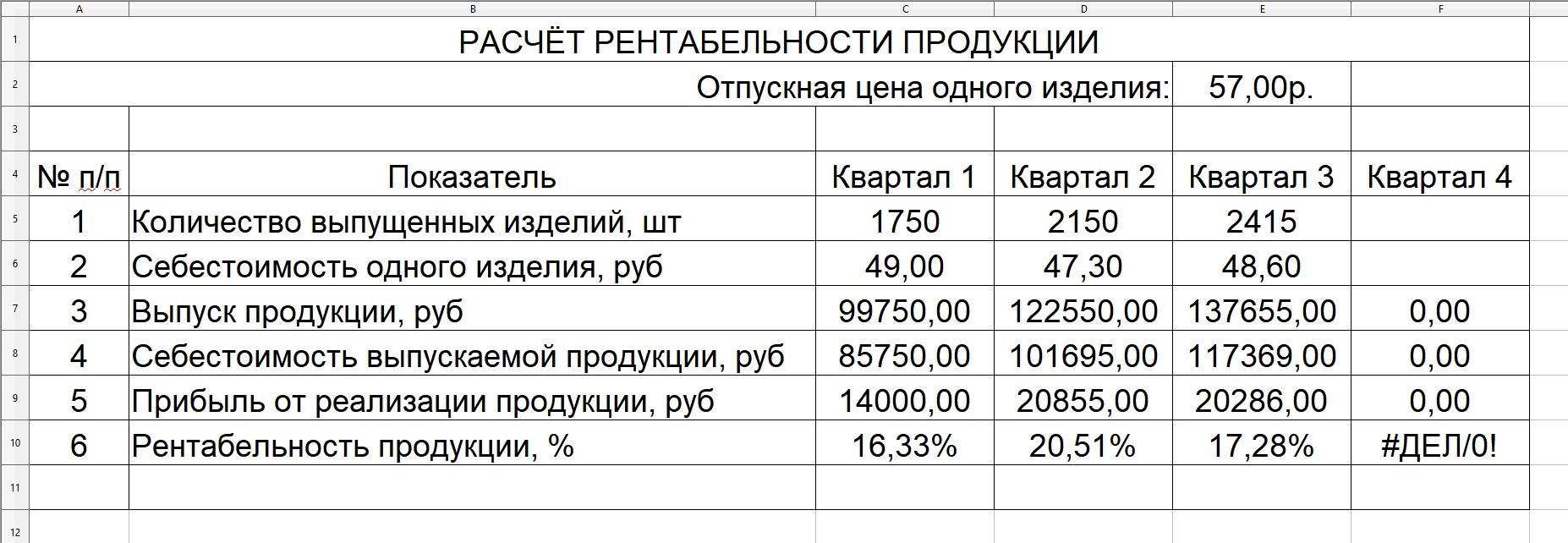 4) Рентабельность продукции = Прибыль от реализации продукции/Себестоимость выпускаемой продукции. В ячейку С10 введите формулу = С9/С8, после чего задайте процентный формат.