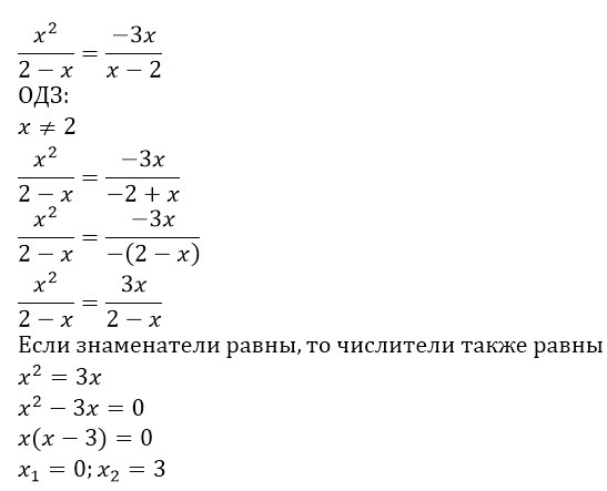 х^2/(2-х)-3х/(2-х)=0|*(2-х) при условии, что 2-х не равно 0