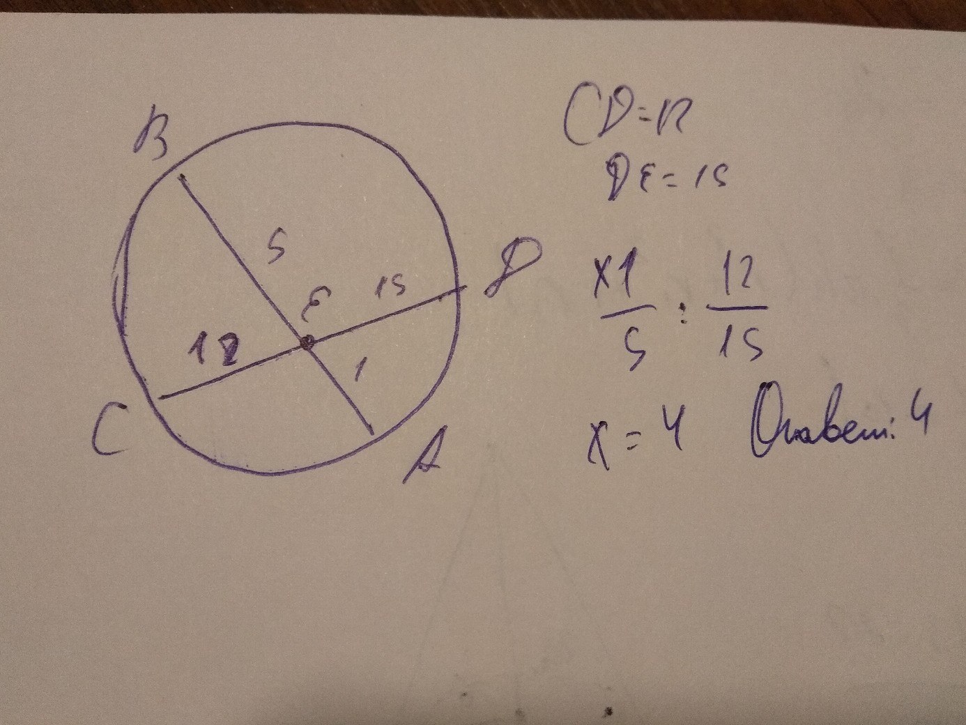 хорды АВ и СД пересекаются в точке Е . Найти длину отрезка АЕ , если он в 5 раз меньше отрезка ВЕ , и известно, что СЕ=12 ДЕ=15
