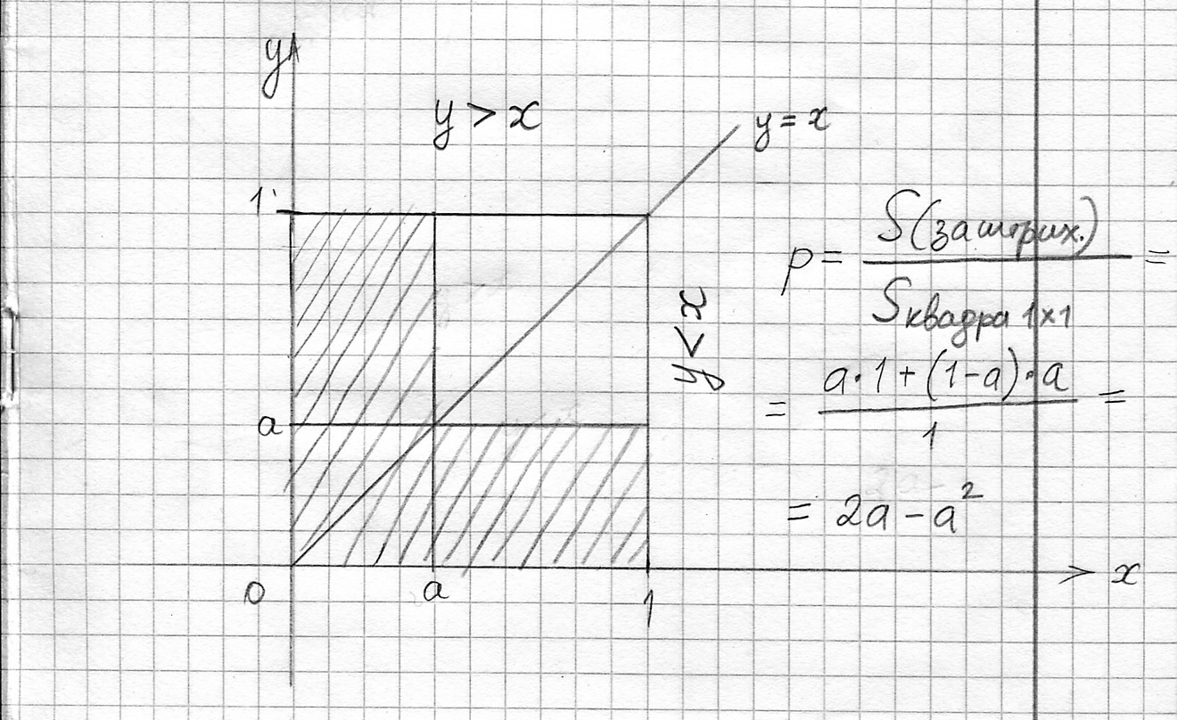 Внутри квадрата с вершинами (0,0); (1,0); (1,1); (0;1) наудачу выбирается точка М (x, y). Найти вероятность того, что min(x, y)<a, (0<a<1)