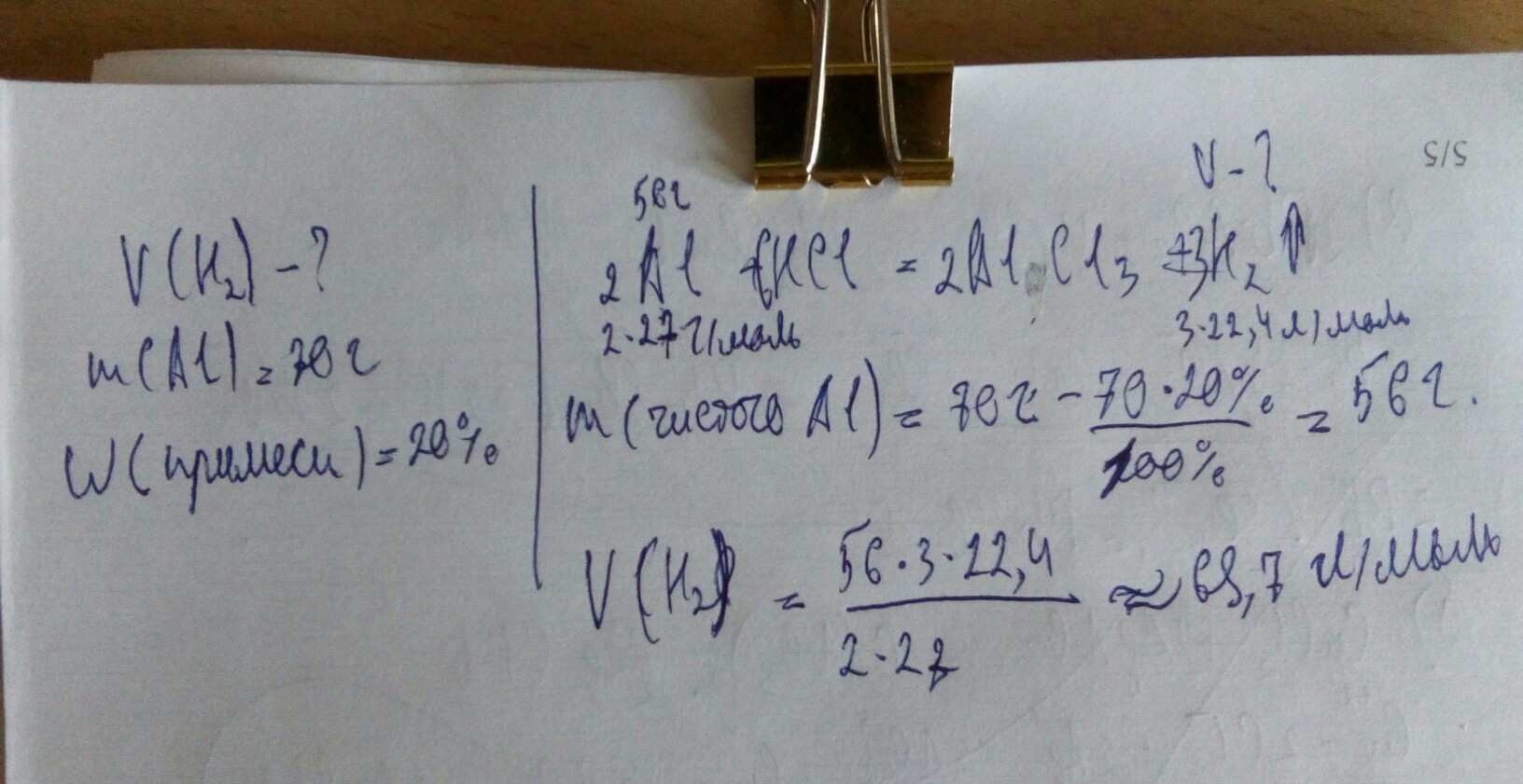 Какой объём (н.у) водорода выделится при обработке 70 г алюминия содержащий 20% примеси необходимым количеством солёной кислоты! Плиз срочно очень пж молю