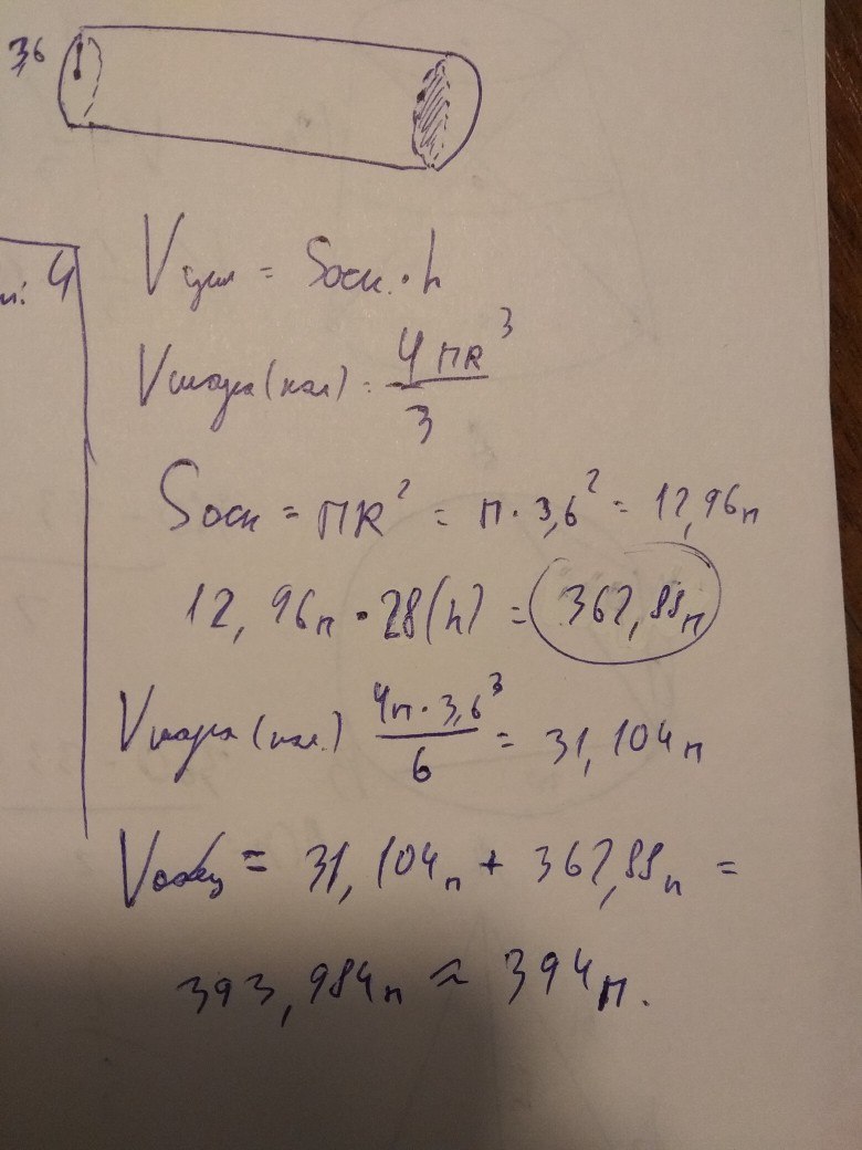 Цилиндрическая труба длиной 28 см кончается полушаром. Вычислить емкость трубки, если ее диаметр равен 3.6 см