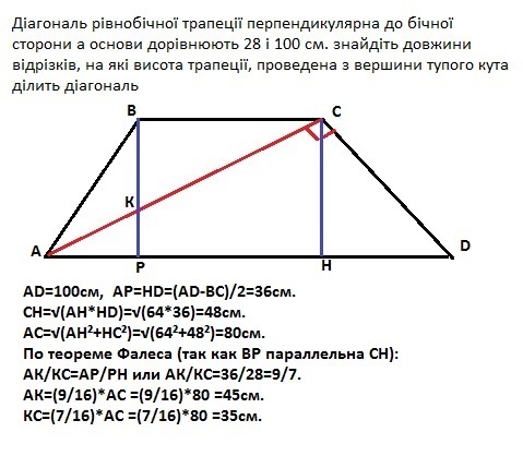 діагональ рівнобічної трапеції перпендикулярна до бічної сторони а основи дорівнюють 28 і 100 см. знайдіть довжини відрізків, на які висота трапеції, проведена з вершини тупого кута ділить діагональ