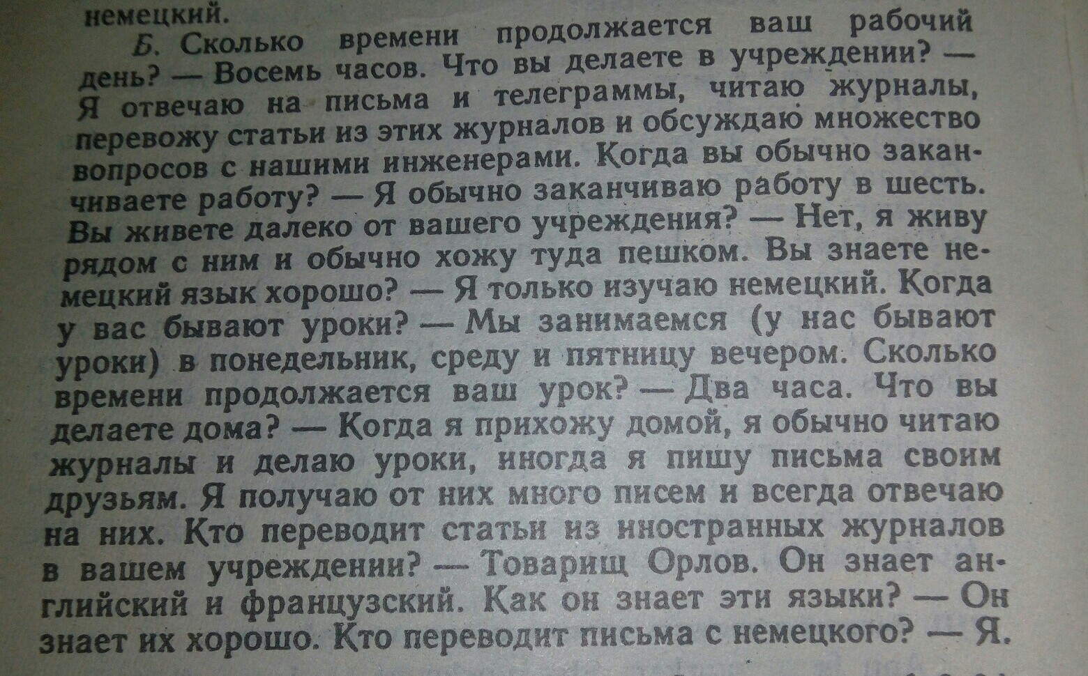 How long does your working day last? It lasts for 8 hours. What do you do in the office? I answer the letters and telegramms, read magazines, translate articles from these magazines and disscuss a lot of questions with our engineers. When do you ususally finish work. I ususally finish work at 6 o'clock. Do you live far from your office? No, I live not far from my office and I usually go there on foot. Do you know German well? I'm only studing it. When do you have your lessons. We have lessons on Monday, Wednesday and Friday evening. How long does your lesson last? It lasts for two hours. What do you do at home? When I come home I usually read magazines and do my homework, sometimes I write letters to my friends. I receive a lot of letters from them and I always answer them. Who translates articles from foreign magazines in your office? Orlov does. He knows English and French. How well does he know these languages? He knows them well. Who translates letters from German? I do.