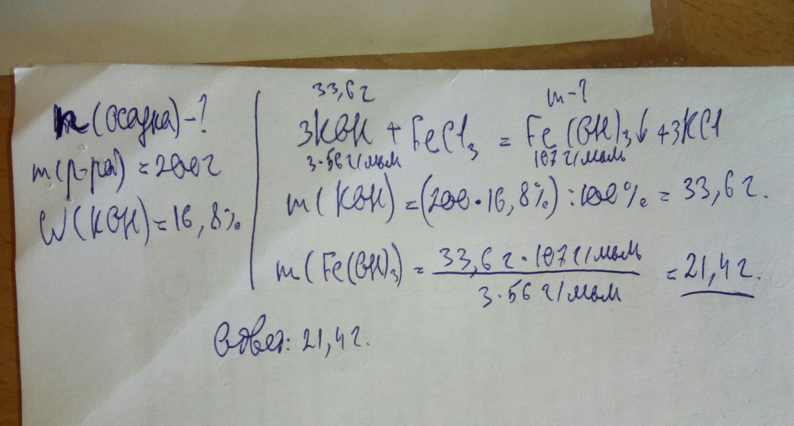 Если не трудно то можно с дано:::Определите количество осадка полученного при сливании 200гр. 16.8% раствора гидроксида (основания) калия с хлоридом железа (III)