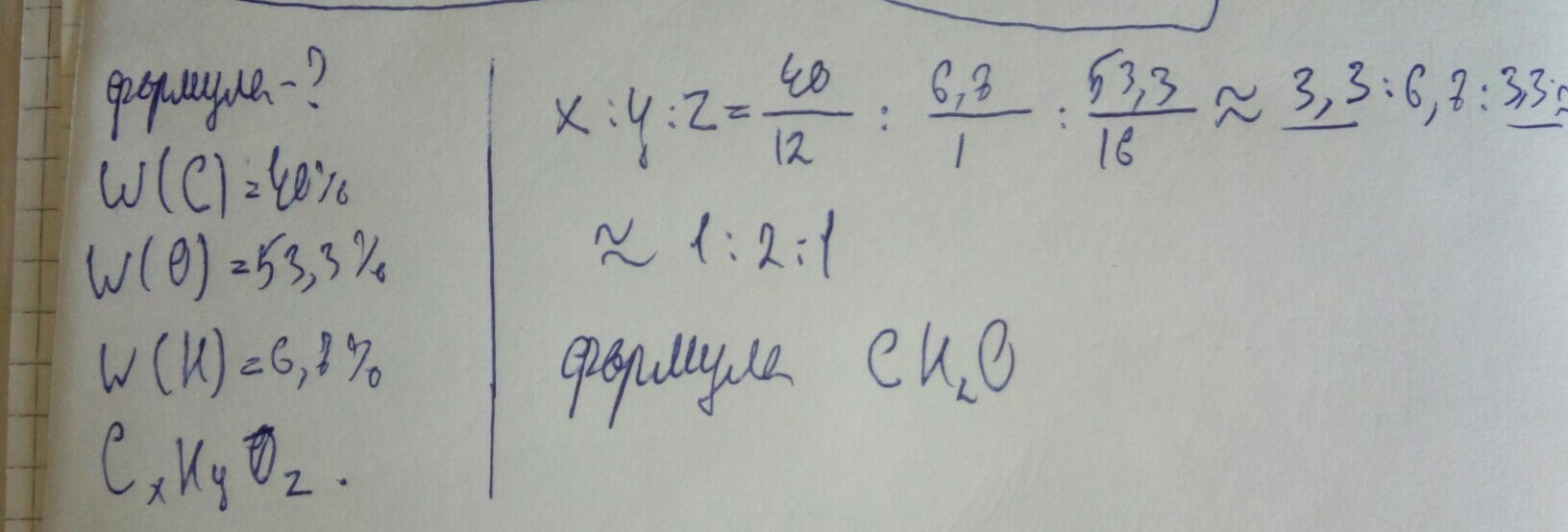 Вопрос: выведите формулу органического вещества по массовым доля элементов : w(c)=40%; w(o)=53,3%; w(H)=6,7%