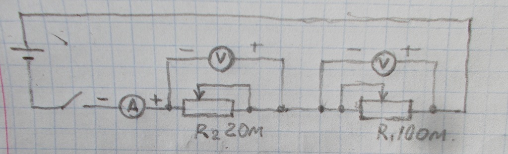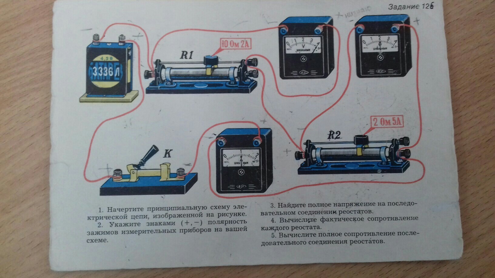 1,2. Рисунок 1. 3. Полное напряжение V = R * I; Найдем общее сопротивление цепи, оно равно Rобщ = R1 + R2 = 10 Ом + 2 Ом = 12 Ом; 4. Сила тока, судя по показанию амперметра равна 1 ампер. Напряжение в последовательной цепи не одинаково и общее напряжение тут будет равно сумме наряжений на реостатах. Vобщ = V1 + V2 = 4В + 2В = 6 В. 4. Iобщ = Vобщ /Rобщ = 6В / 12 Ом = 0,5А. Так как в последовательной цепи сила тока на всех участках одинакова, то R1 = Vпр / I общ = 4В / 0,5 = 8 Ом;