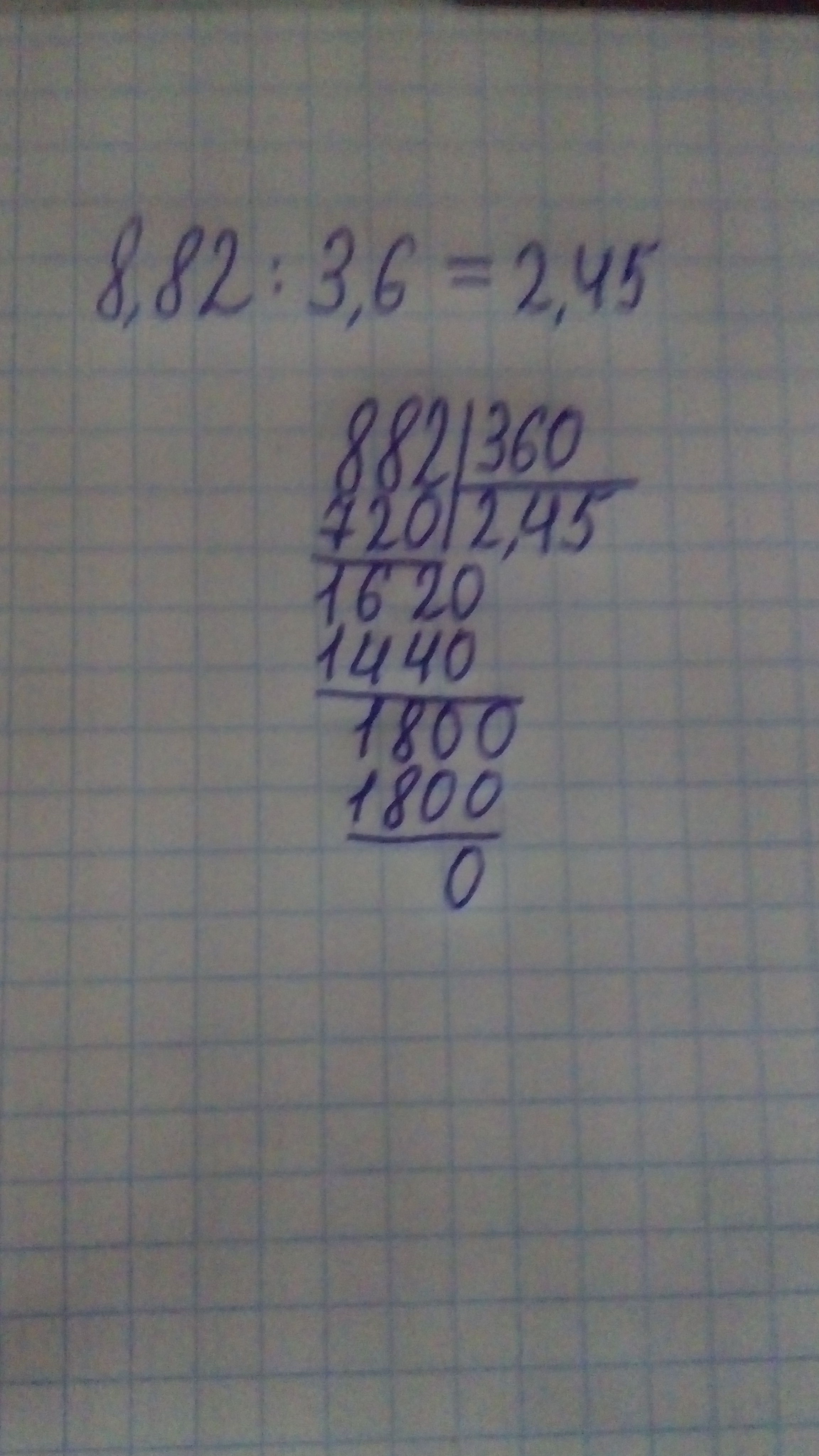 Прежде, чем вы разделим в столбик, нужно преобразовать эти два числа в обычные целые. Мы первый делитель 8,82 и второй делитель 3,6 умножаем на 100. Получаем 882 и 360. Далее делим в столбик.