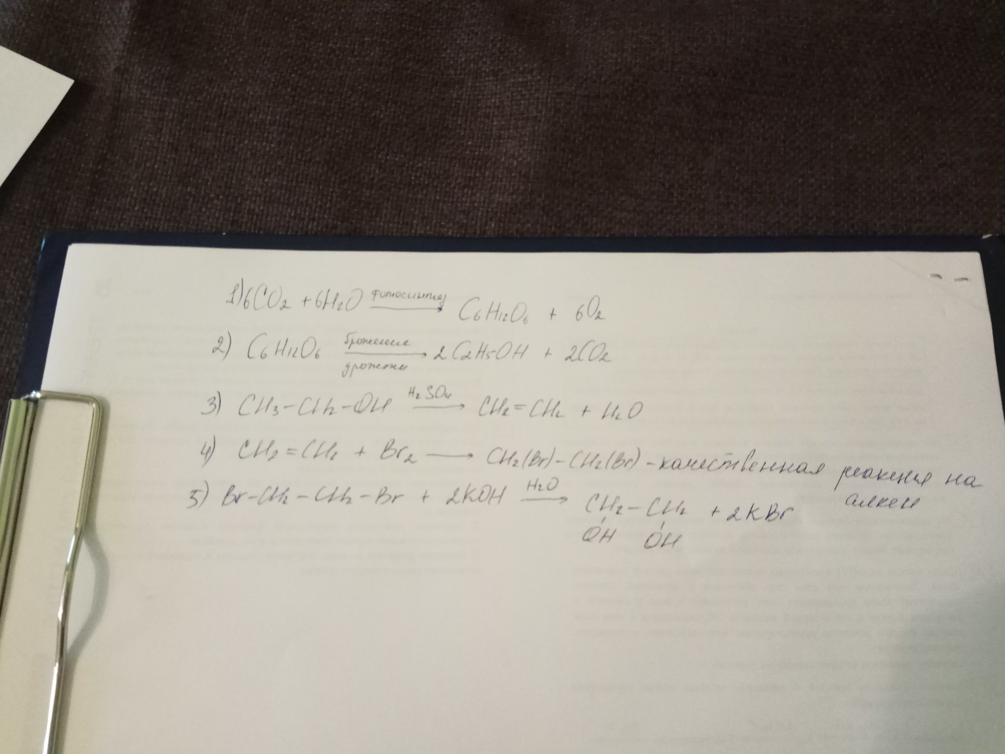 CO2 --> C6H12O6 --> C2H5OH --> C2H4 --> CH2Br -- CH2Br --> CH2OH -- CH2OH
