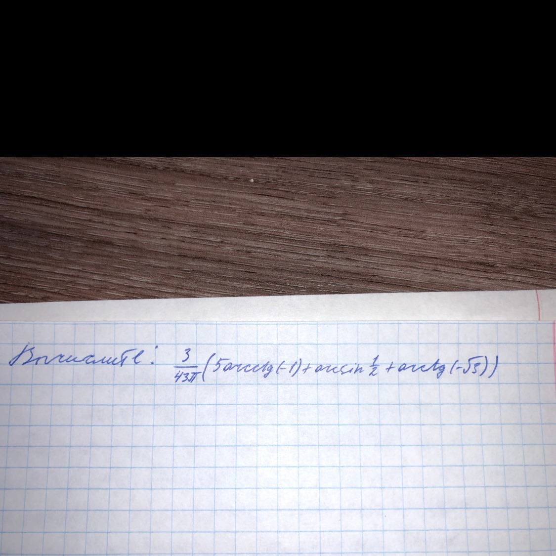 frac{3}{43 pi }(5arcctg(-1)+arcSin frac{1}{2} +arctg(- sqrt{3}))= frac{3}{43 pi }(  5*frac{3 pi }{4} +  frac{ pi }{6} - frac{ pi }{3} )=   = frac{3}{43 pi } ( frac{15 pi }{4} - frac{ pi }{6} )= frac{3}{43 pi }* frac{45 pi -2 pi }{12} = frac{3*43 pi }{43 pi *12}= frac{1}{4} =0,25