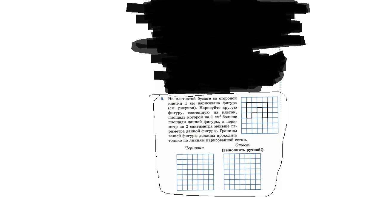 На клетчатой бумаге со стороной клетки 1 см нарисована фигура. Нарисуйте другую фигуру, состоящую из клеток, площадь которой 1см2 больше площади данной фигуры, а периметр на 2см меньше данной фигуры