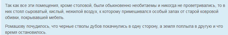 1) Так как все эти помещения, кроме столовой, были необыкновенно необитаемы и никогда не проветривались, то в них стоял сыроватый, кислый, нежилой воздух, к которому примешивался особый запах от старой ковровой обивки, покрывавшей мебель.