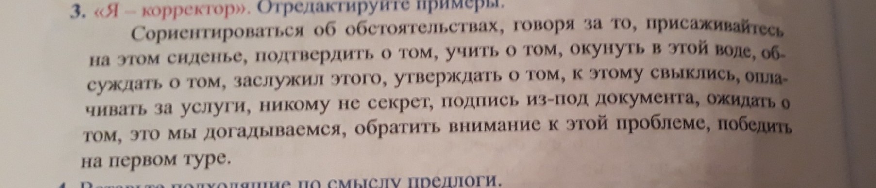сориентироваться в обстоятельствах, говоря про то,присаживайтесь на это сиденье, подтвердить то, учить то, окунуть в эту воду, обсуждать то, заслужил это, утверждать то, с этим свыклись,оплачивать услуги,не для кого не секрет, подпись под документом, ожидать то, об этом мы догадываемся, обратить внимание на эту проблему, победить в первом туре