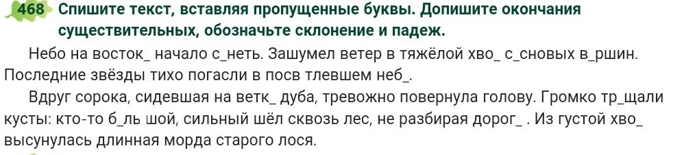 Небо на востоке (2 скл., п.п.) начало синеть. Зашумел ветер в тяжёлой хвое (1 скл., п.п.) сосновых вершин. Последние звёзды тихо погасли в посветлевшем небе (2 скл., п.п.). Вдруг сорока, сидевшая на ветке (1 скл., п.п.) дуба, тревожно повернула голову. Громко трещали кусты: кто-то большой, сильный шёл сквозь лес, не разбирая дороги (1 скл., р.п.).Из густой хвои (1 скл., р.п.) высунулась длинная морда старого лося.