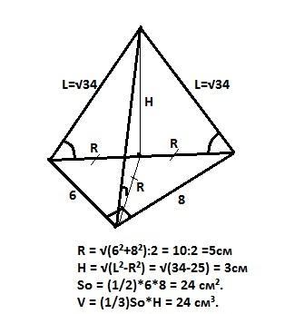все боковые ребра треугольной пирамиды составляют с основанием равные углы, а основанием пирамиды является прямоугольный треугольник с картами 8 и 6 см. найти объём пирамиды, если длина бокового ребра пирамиды равна √34 см