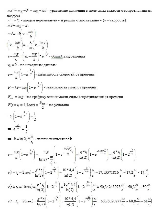 Супер! А я, увы, в готовом не могу разобраться. Правдоподобно. Лучше бы, если в условии не было слов: "считать что сила сопротивления воздуха равна половине от максимального значения в момент времени t1 = 4,4 сек." Можно было догадаться.