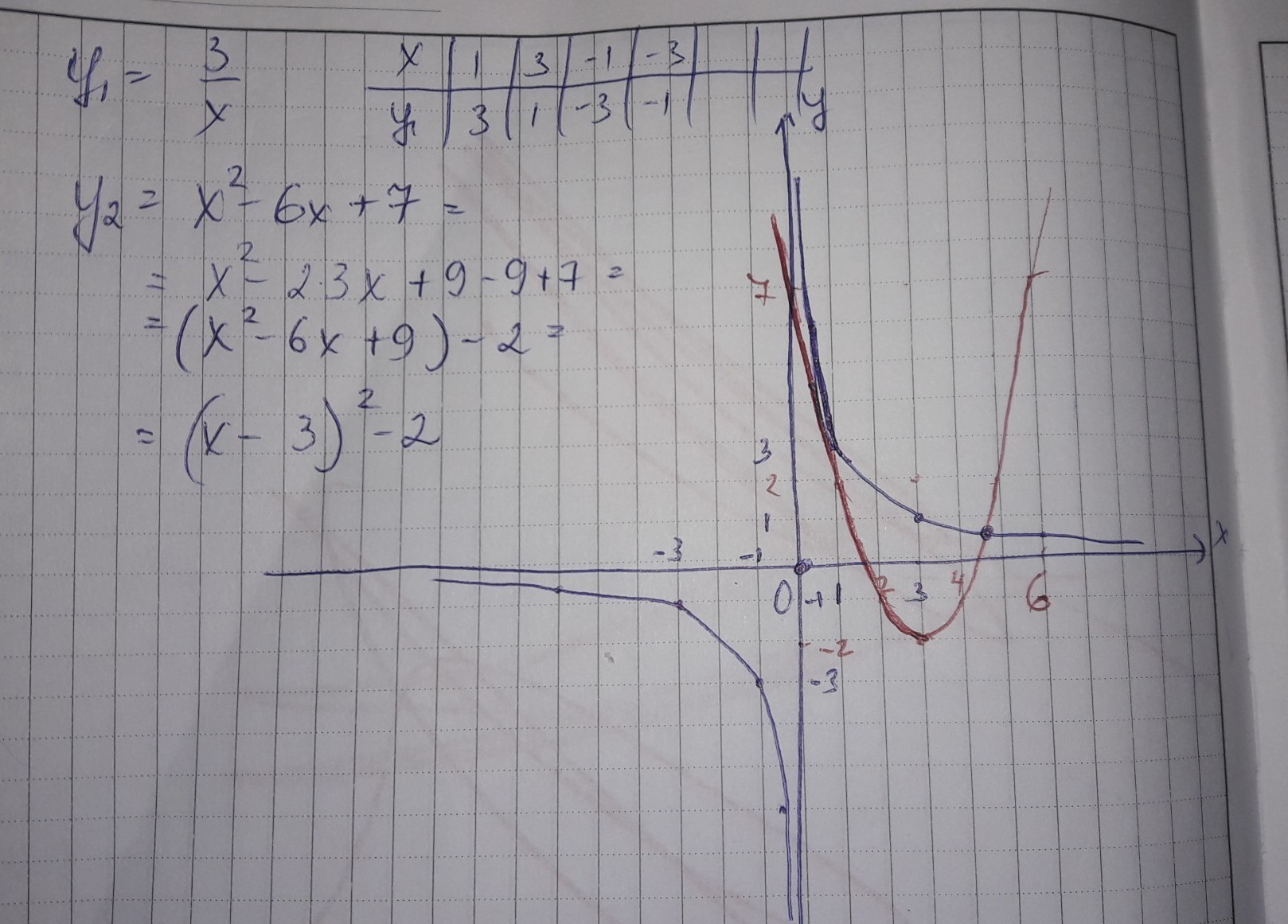решить данное уравнение можно графически. для этого разобьем его на две функции. у1=3/х и у2=х²-6х+7. (решение на фото).