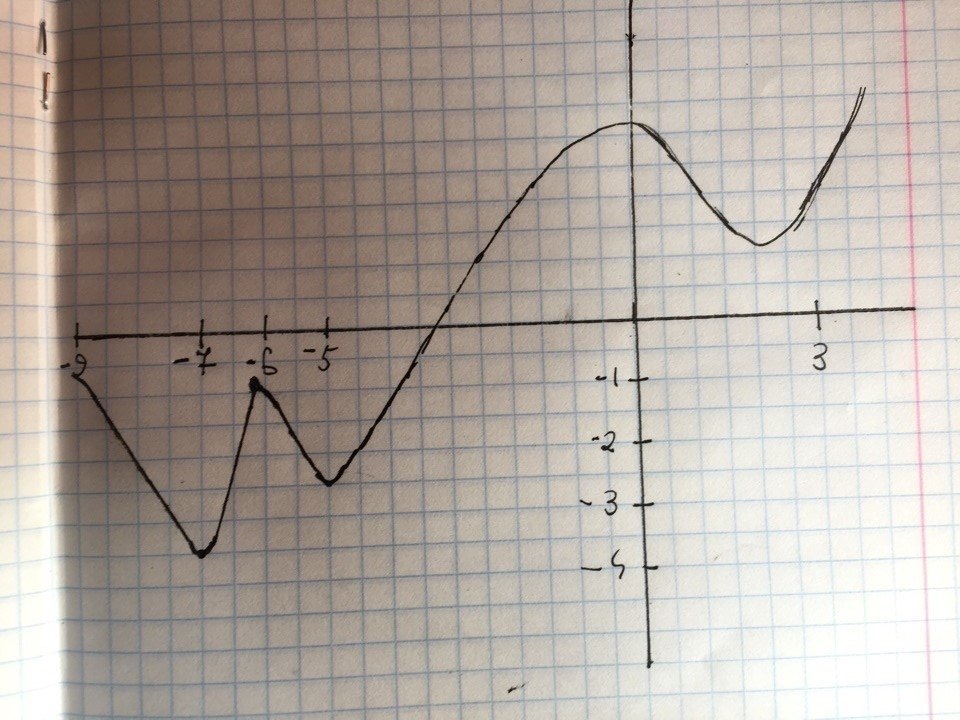 На рисунке изображён график y=f'(x) — производной функции f(x), определенной на интервале (-9; 3). В какой точке отрезка [-7; -5 ] функция f(x) принимает наибольшее значение?