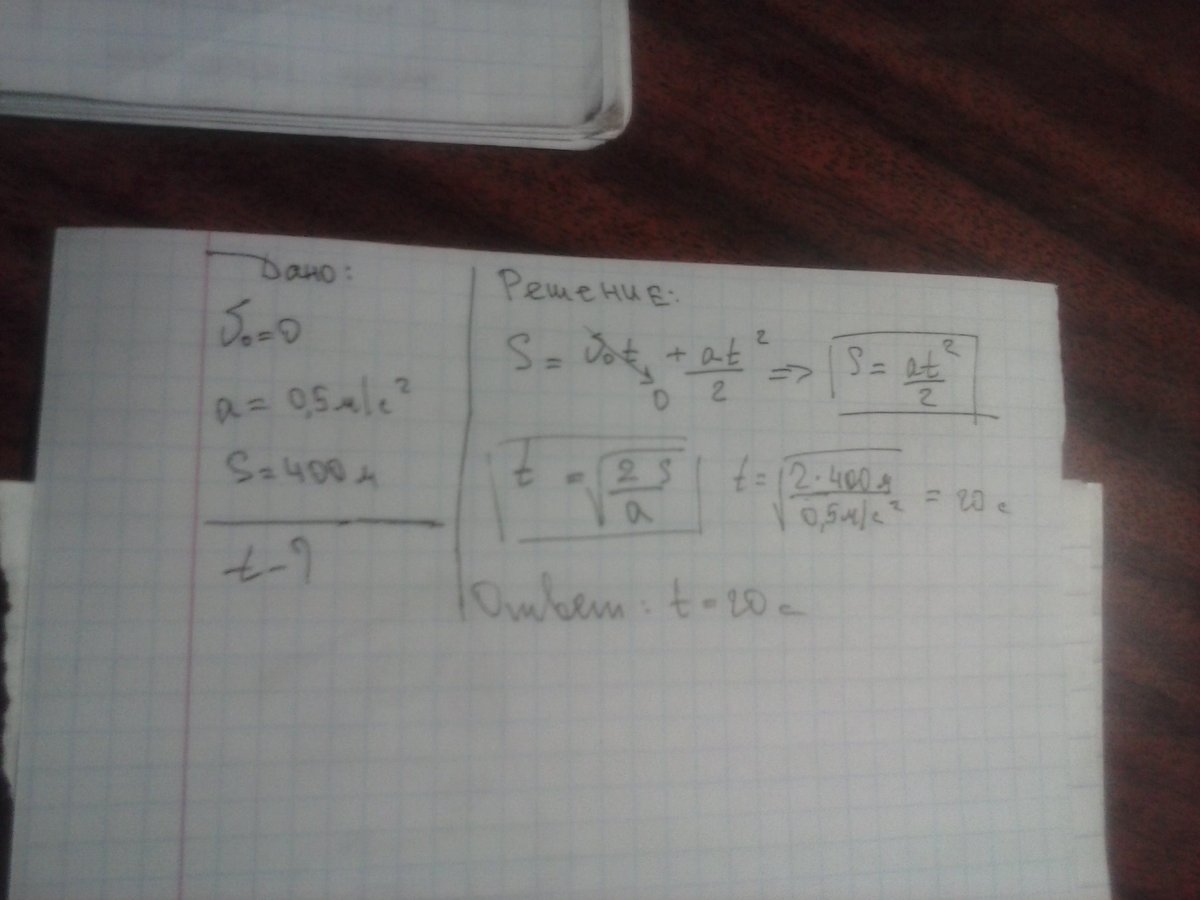 Автомобиль движется из состояния покоя с ускорением 0,5 м/с2. За какое время автомобиль пройдет путь 400м ?