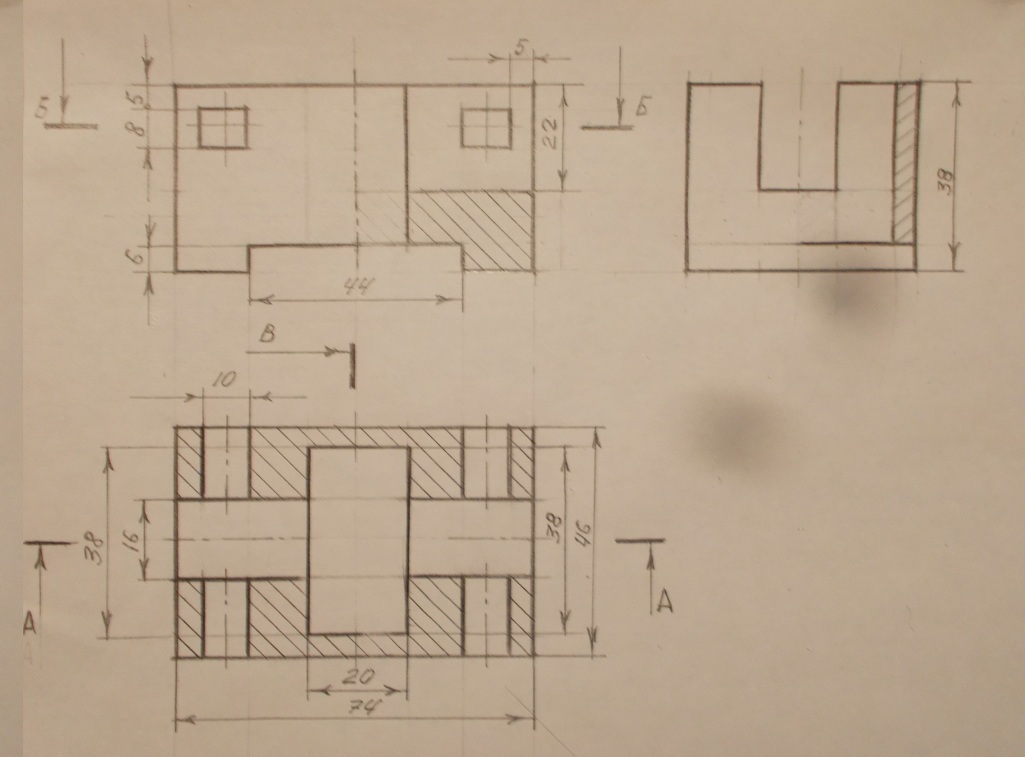 Стрелки А-А - убрать и обозначение А-А наносить не нужно: обозначение Б-Б проставить над видом сверху; стрелки В-В - убрать и обозначение В-В наносить не нужно