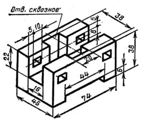 И четыре отверстия 8 на 10. Секущая проходит через центры этих отверстий, то есть выше двух призматических отверстий, расположенных на горизонтальном разрезе снизу и с верху.