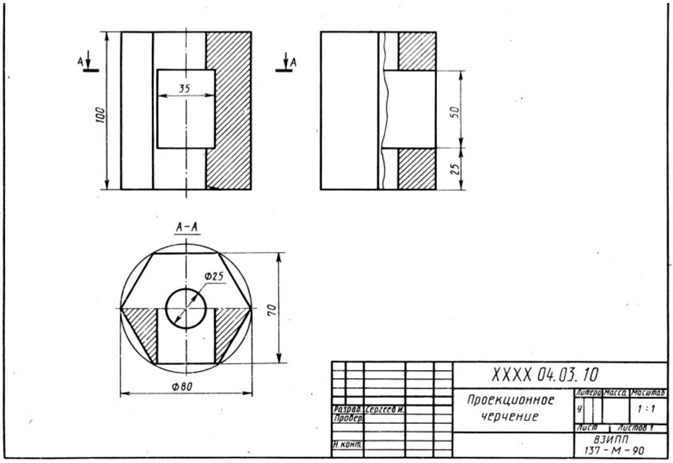 основных ортогональных вида, выполнить полезные разрез (разрезы), размерные линии. Чертеж построить в масштабе 1:1. Пример выполнения графической работы дан на рисунке