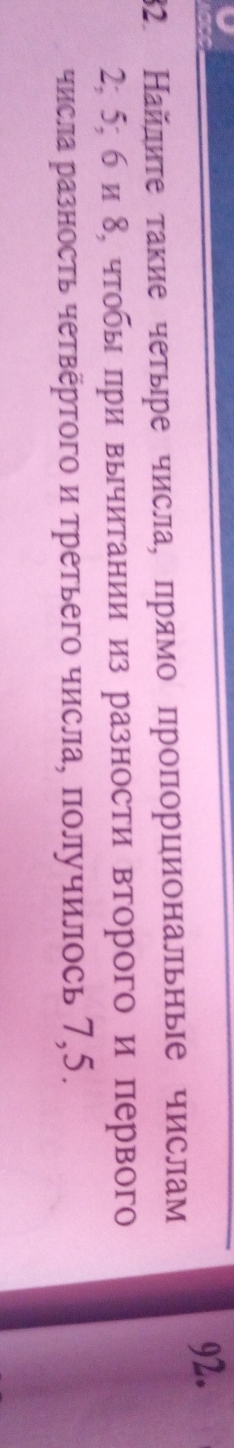 Если коэффициент пропорциональности равен 7,5, тогда первое число 2х7,5=15, второе 5х7,5=37,5, третье 6х7,5=45 и четвертое 8х7,5=60.