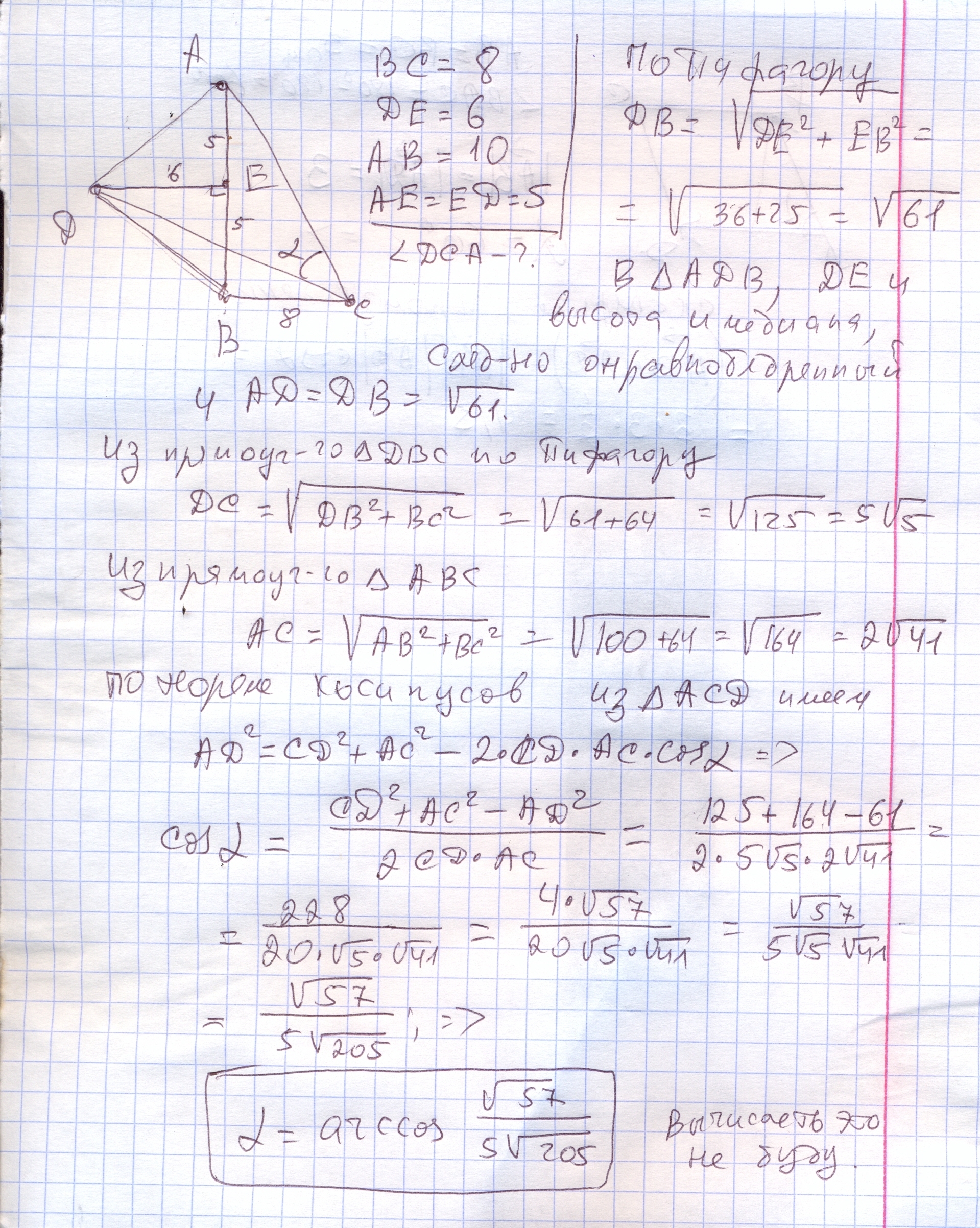 В точке В восстановлен перпендикуляр BC к плоскости равеый 8.Опредилите угол DCA