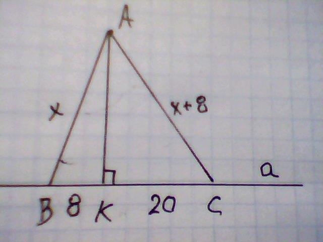 ΔАСК. По условию АС=х+8; АК²=АС²-СК²=(х+8)²-20²=х²+16х+64-400.