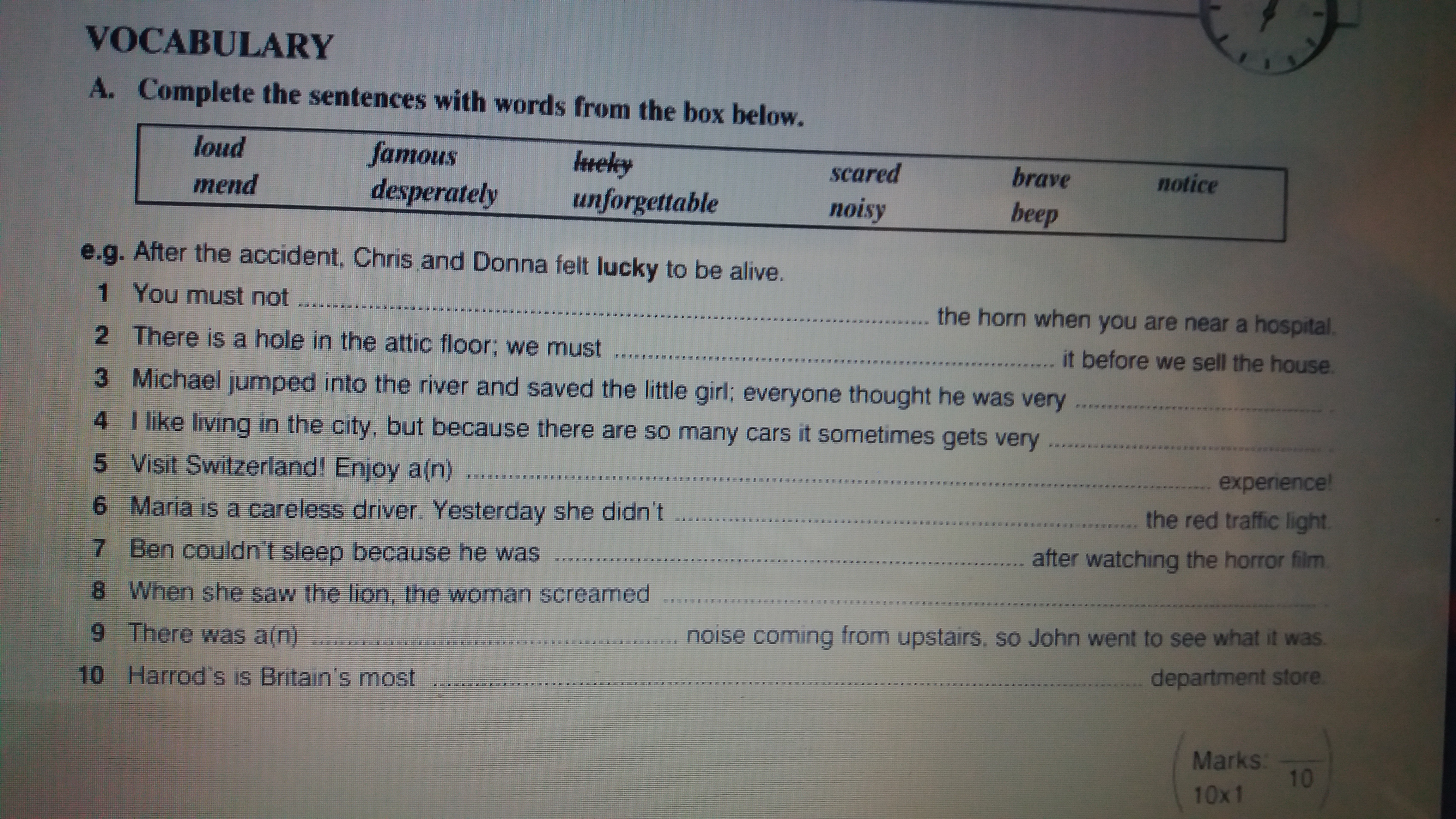beep; mend; brave; noisy; unforgettable; notic; desperately; loud;scared; famous;