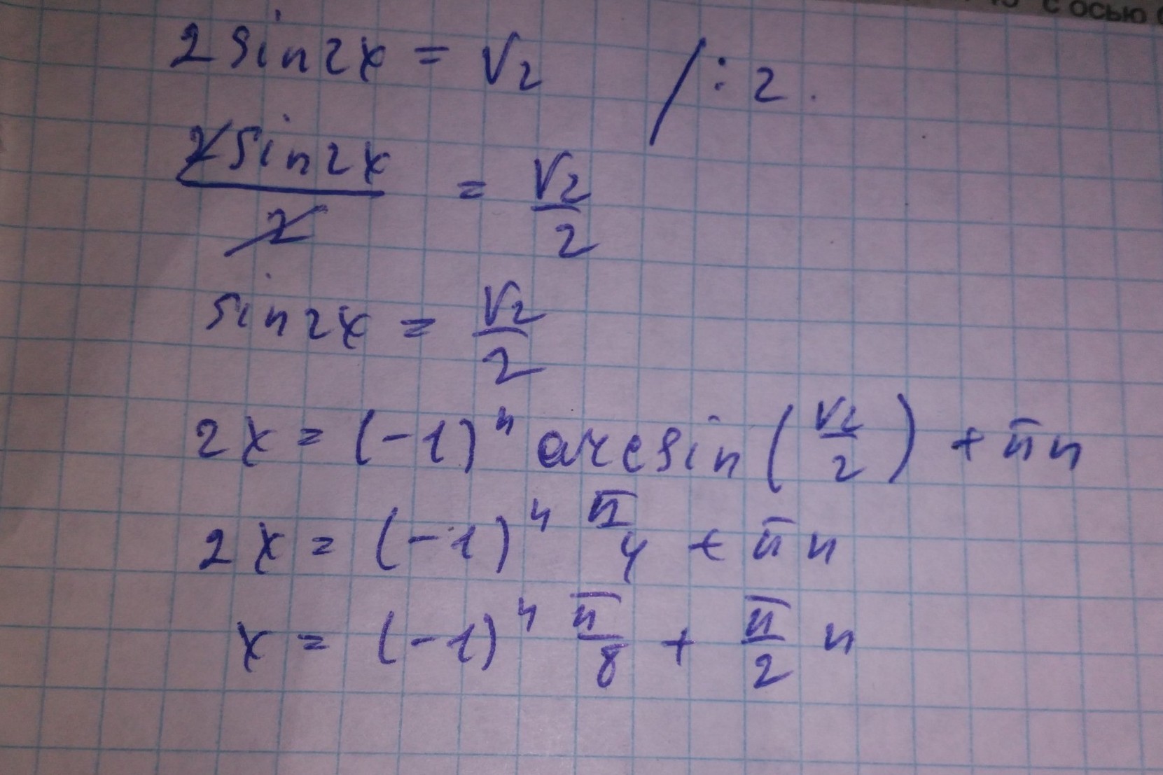 2x=(-1) в степени n* arcsin корень из 2/2+Пn