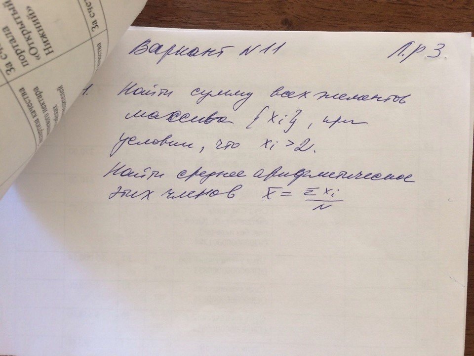 int main(){ const int n = 10; int counter = 0; int summ = 0; double avg; double mass[n] = {}; for (int i = 0; i < n; i++) { if (mass[i] > 2) { summ += mass[i]; counter++; } } avg = summ / counter; cout << avg << endl; system("pause>>void"); return 0;}