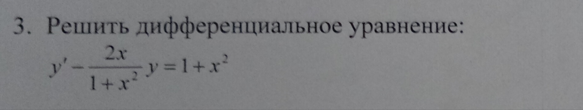 y'-frac{2x}{1+x^2}y=1+x^2\y=uv;y'=u'v+v'u\u'v+v'u-frac{2x}{1+x^2}uv=1+x^2\u'v+u(v'-frac{2x}{1+x^2}v)=1+x^2\begin{cases}v'-frac{2x}{1+x^2}v=0\u'v=1+x^2end{cases}\frac{dv}{dx}-frac{2x}{1+x^2}v=0\frac{dv}{v}=frac{2x}{1+x^2}dx\intfrac{dv}{v}=intfrac{d(1+x^2)}{1+x^2}\ln|v|=ln|1+x^2|\v=1+x^2\u'(1+x^2)=1+x^2\u'=1\du=dx\u=x+C\y=uv=(1+x^2)(x+C)
