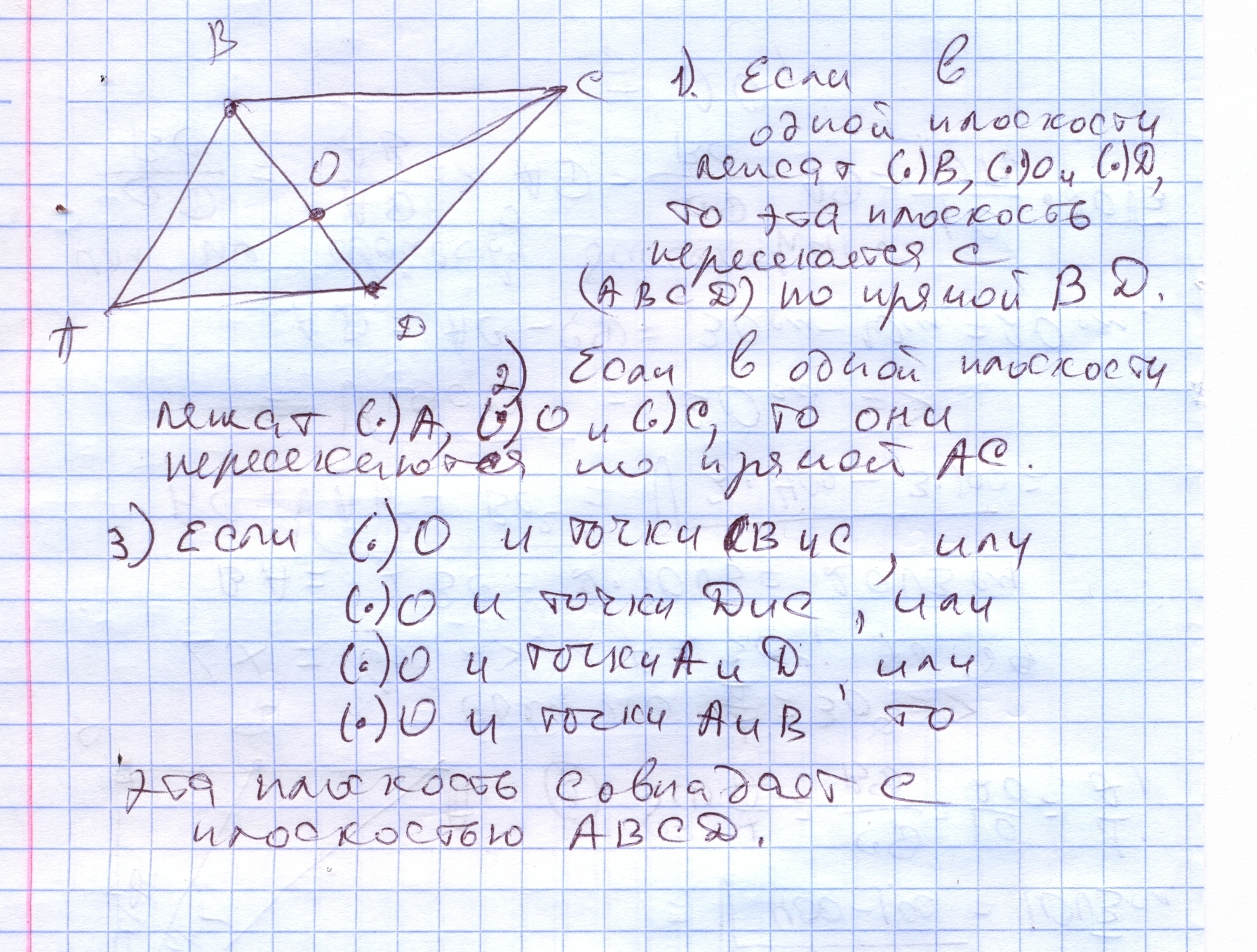 Две вершины и точки пересечения диагоналей параллелограмма лежат в одной плоскости. Какое взаимное расположение параллелограмма относительно этой плоскости.