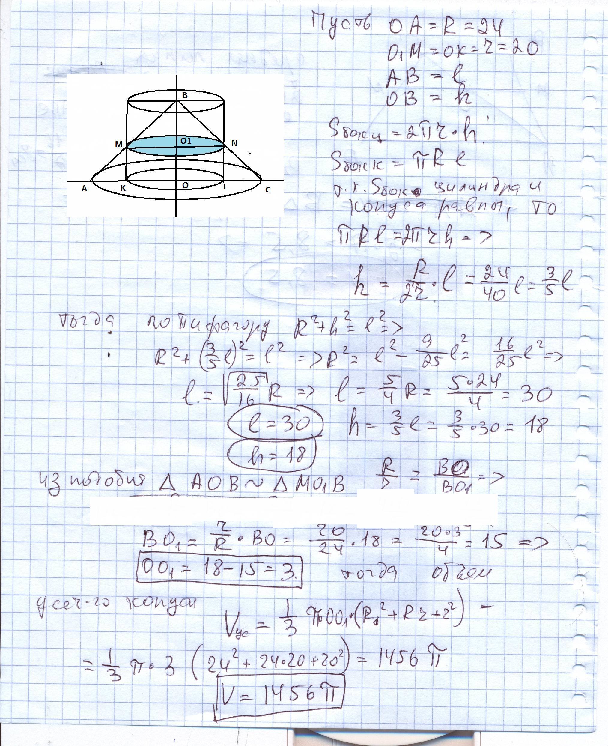 высота цилиндра, проходящая по его оси, совпадает с высотой конуса. Найдите объём усеченного конуса, который отсекается от