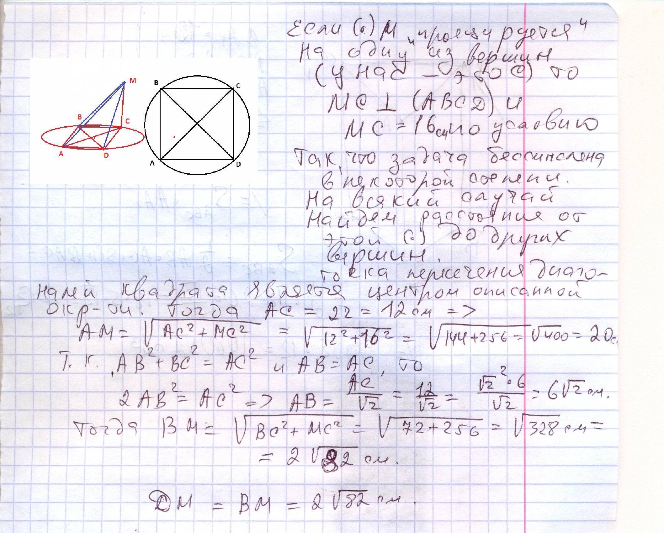 Точка М, находящаяся над плоскостью квадрата на расстоянии 16 см, проецируется в одну из его вершин. Определите расстояние этой точки от вершины квадрата, если радиус круга, описанного вокруг этого квадрата равен 6 см
