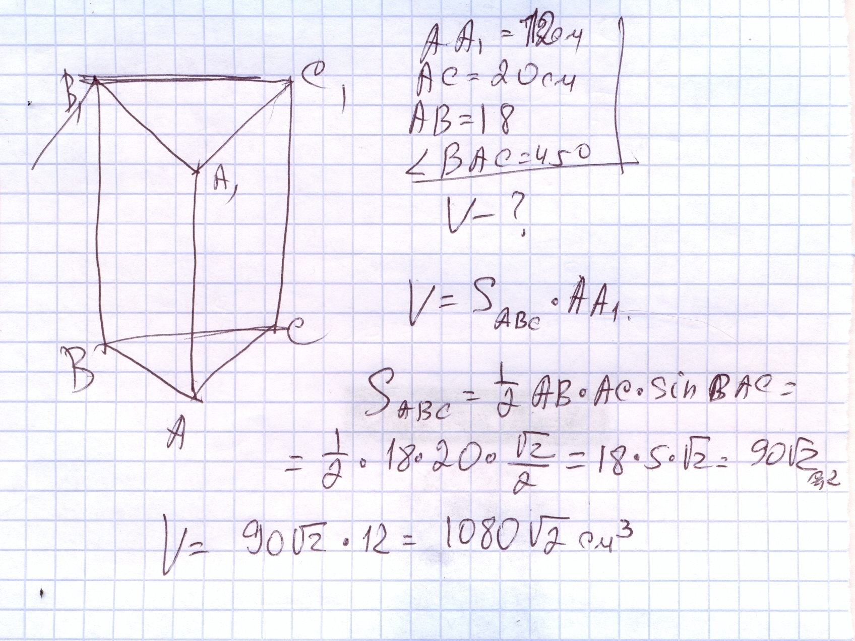Помогите пожалуйста : Найдите объём прямой призмы ABCA1B1C1 <BAC=45градусов BA=18см AC=20см AA1=12С